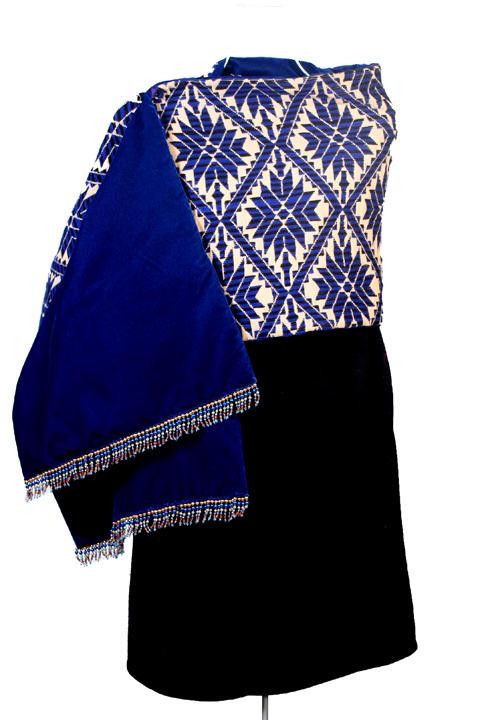 Chalinas en color azul y rojoEn materiales, con un toque en Terciopelo cristal combinada con tela en algodón con bordados auténticos a mano de artesanos Mexicanos en hilos de diferentes colores.