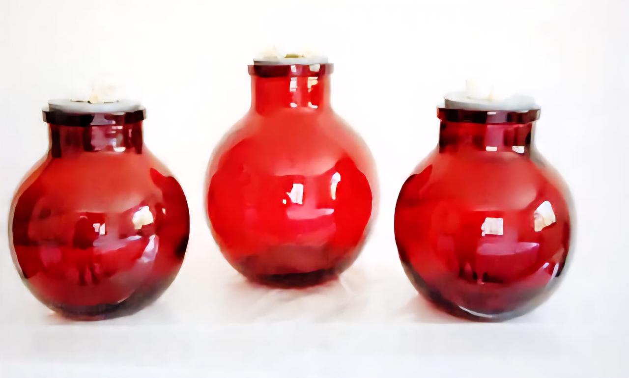 Set de tres Botellones en vidrio Español color cereza con tapa en corcho color plateado con incrustaciones con caracoles de mar naturales.